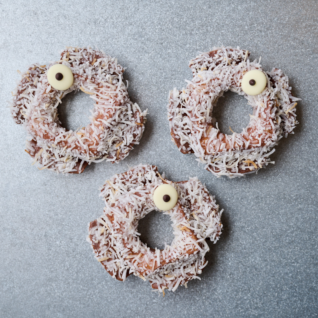 ふわっと香るオールドファッション生地に、バニラグレーズとたっぷりのココナッツ。キョロッとした一つ目でこちらを見つめる、おとぼけ顔がクセになるゆるキャラ系!