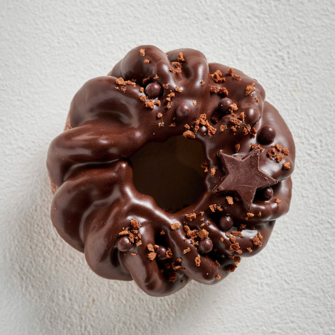 ココアを練り込んだ軽い食感のフレンチクルーラー生地にチョコレートをコーティング。スターチョコやクランチなど、さまざまな食感が楽しめるシックなドーナツです。