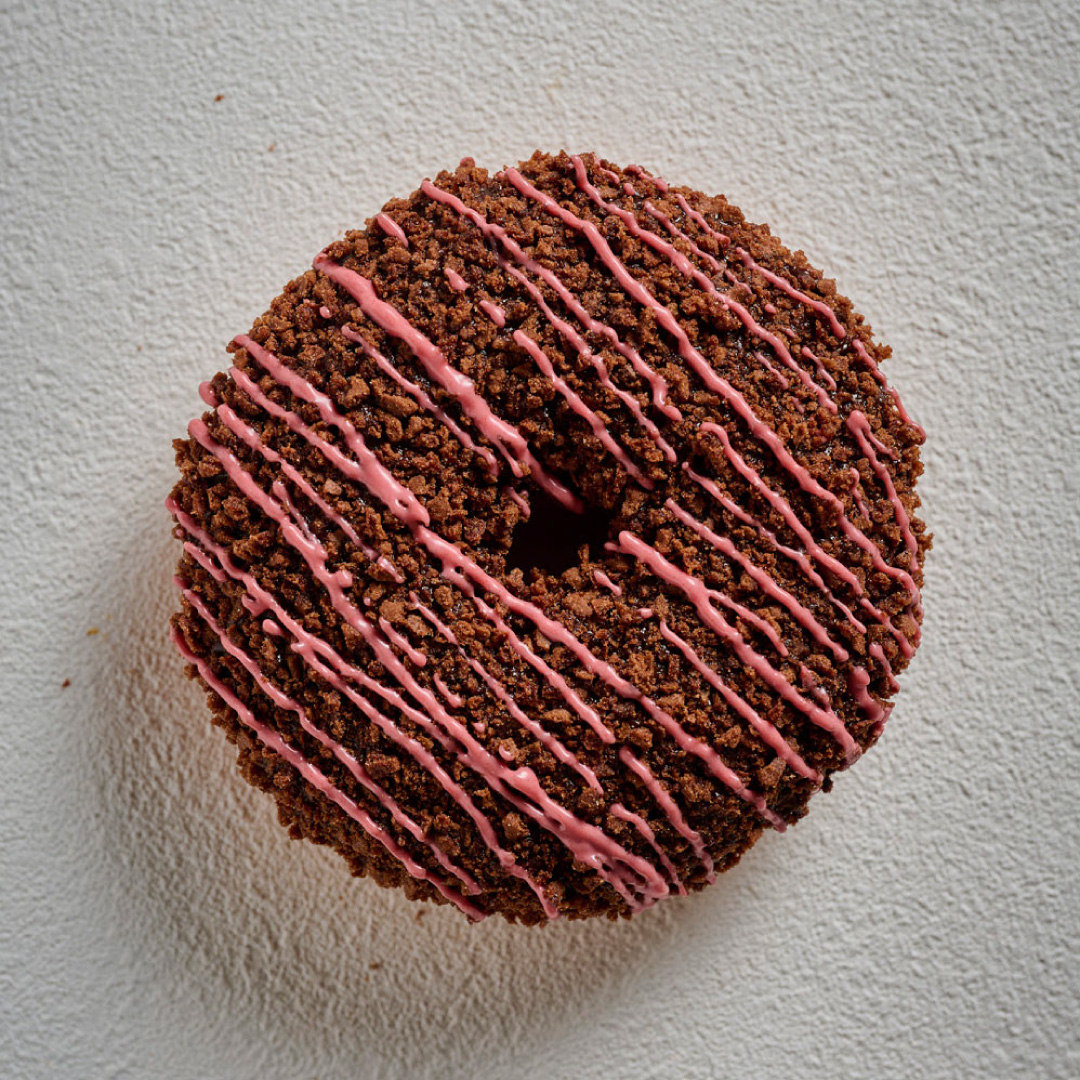 ふわふわのブリオッシュ生地にダークチョコレートをまとわせ、チョコクランチをたっぷりと。いちごチョコで描いたピンクのラインがアクセントになっています。